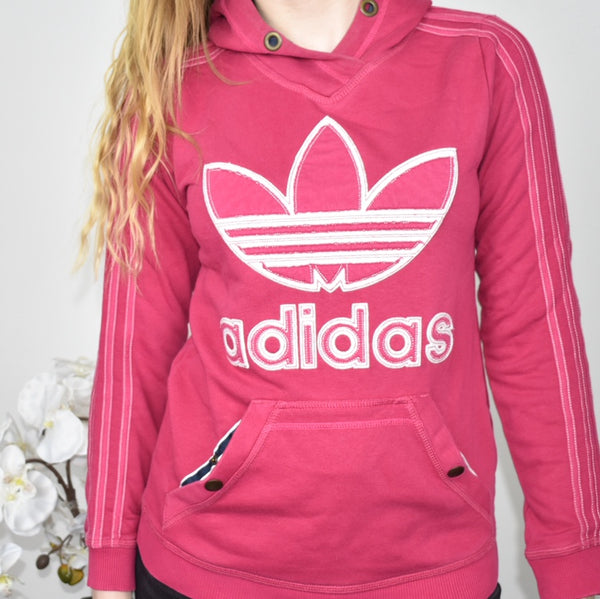 Cute sporty Adidas hoodie track jacket hoodie jumper sweater top cardigan pullover in bright punk. Has a big spellout logo on the front.💗 Great condition. Label says size 46, we recommend S. Model is 168cm/5’6. Free shipping on bundles.