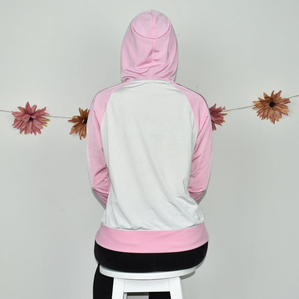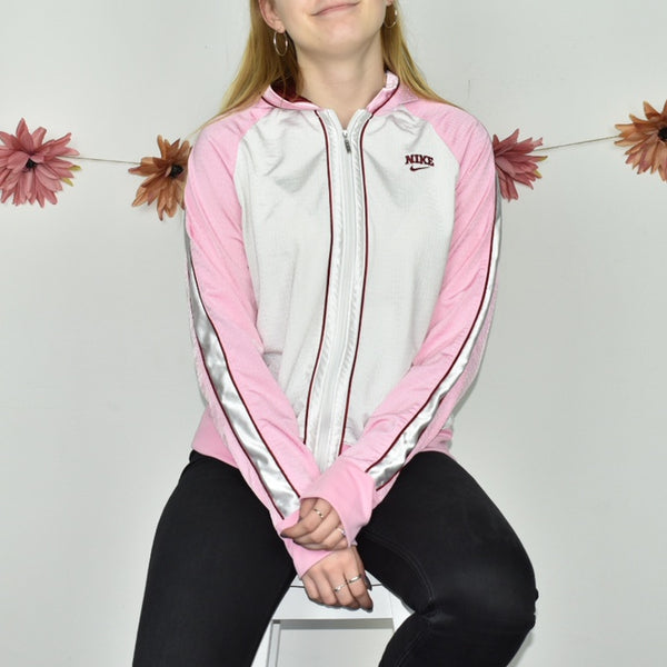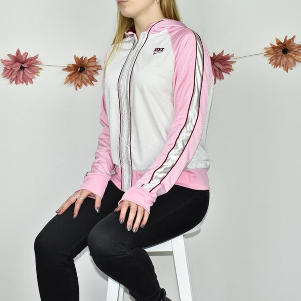 Cute sporty Nike fleece track jacket hoodie jumper sweater top cardigan pullover in white and pink. Has a logo on the front.💗 Great condition. Label says XL(16-18), we recommend L. Model is 168cm/5’6. Free shipping on bundles.