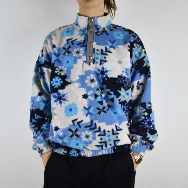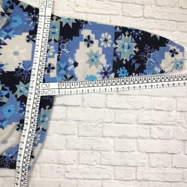 Vintage 80s 90s fleece sweater button up neck with blue snowflake pattern. Unisex. Same/Next day UK postage, instant buy is on! Features a light reflective neck detail. Size large best fitting, measurements in pictures. Great condition. Very comfy and warm. Great for cold weather.