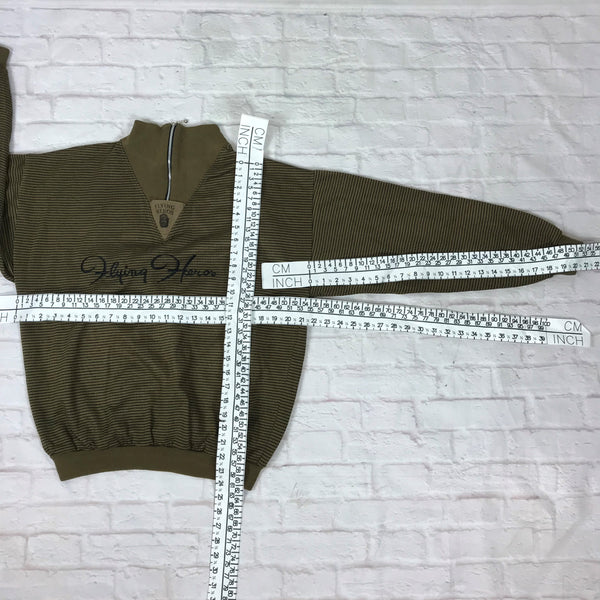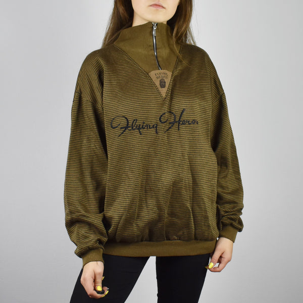 Vintage 80s 90s zipneck sweatshirt sweater pullover jumper in khaki brown and stripes. Unisex. Same/Next day UK postage, instant buy is on! Good condition. Size S/M best fitting. Model is 163cm/5ft4. 40% cotton 60% acrylic