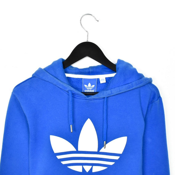 Vintage Adidas hoodie pullover sweatshirt windbreaker fleece track jacket in blue and white. Unisex. Same/Next day postage, instant buy is on! Very good condition. Has a big spell out logo on the front. Label says S, we recommend M.
