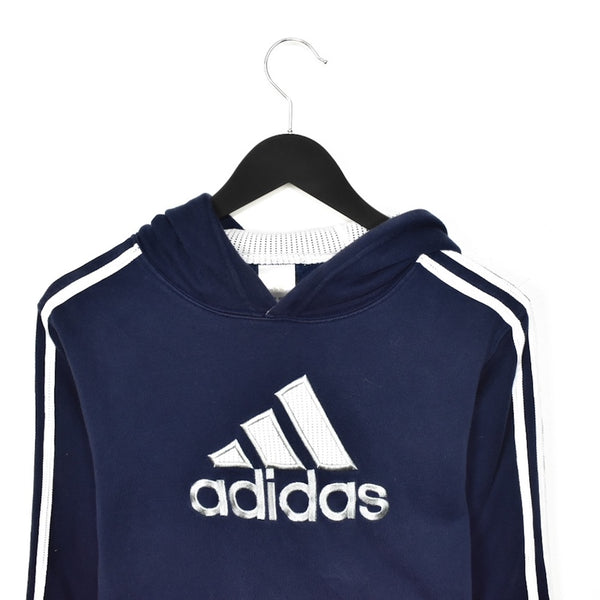 Vintage Adidas hoodie pullover sweatshirt windbreaker fleece track jacket in dark blue and white. Unisex. Same/Next day postage, instant buy is on! Very good condition. Has an embroidered spell out logo on the front. Label says M, we recommend M.