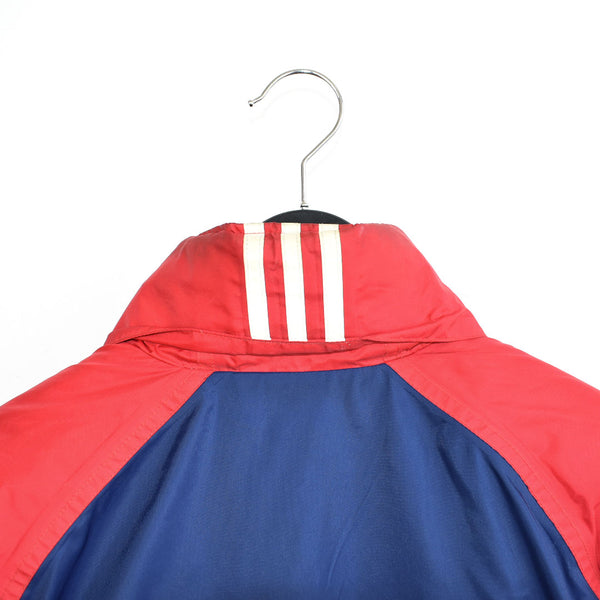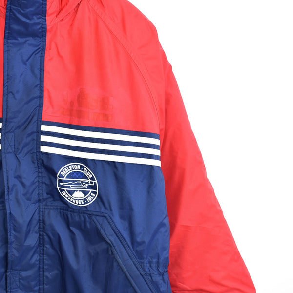 Vintage Adidas long puffer jacket windbreaker fleece track jacket bomber jacket in blue and red. Unisex. Same/Next day postage, instant buy is on! Good condition. Faults are shown in the picture: faded writings on the front, zipper is replaced by a clip. Has a logo on the front. Label says L, we recommend L.