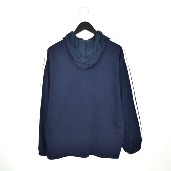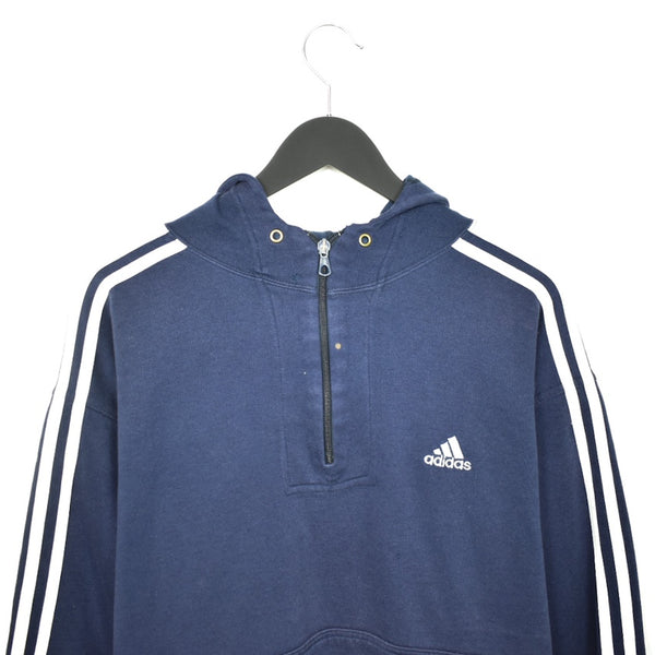 Vintage Adidas quarter zip up hoodie sweater jumper sweatshirt pullover long sleeve tracksuit trackie jacket in dark blue and white. Unisex. Same/Next day UK postage, instant buy is on! Good condition. Faults are shown in the picture: stains on one of the sleeves. Features Adidas logo on the front. We recommend M.