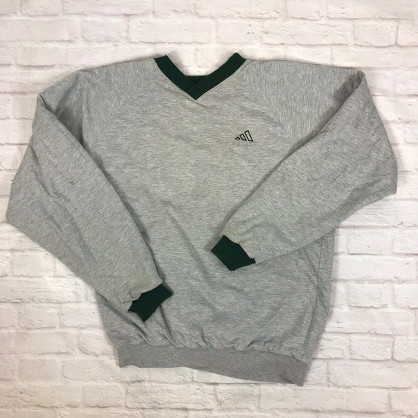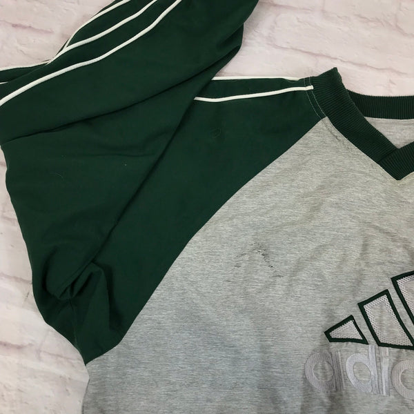 Vintage Adidas reversible v-neck sweatshirt jumper sweater pullover hoodie in gray and green. Unisex. Same/Next day postage, instant buy is on! Good condition apart from minor scratches on the chest and few other stains on the reversed side. Has a logo on the front. Size L best fitting. Model is 165cm/5ft5. Please message with any questions 👌