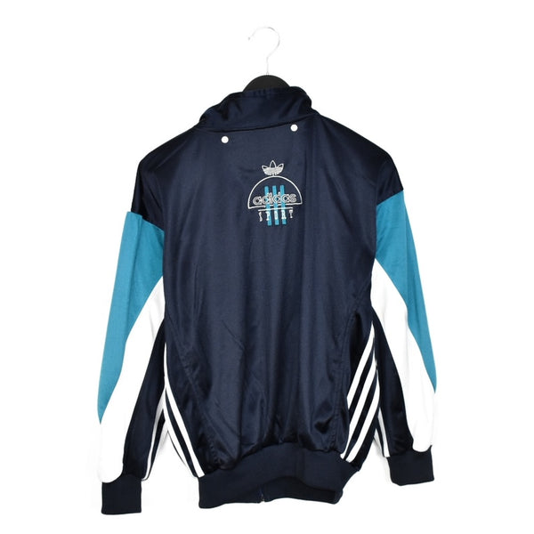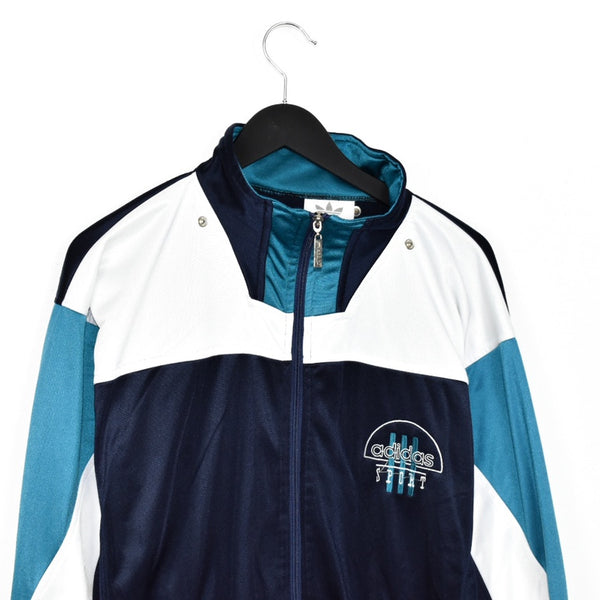 Vintage Adidas sport windbreaker zip up tracksuit track jacket trackie sweater jumper sweatshirt pullover long sleeve in blue and white. Unisex. Same/Next day UK postage, instant buy is on! Good condition. Has a stain on one of the sleeves. Features logo on the front. We recommend L.