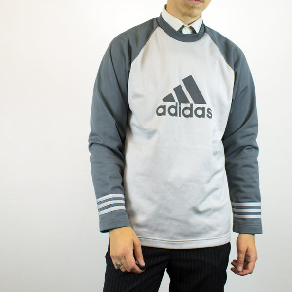 Vintage Adidas sweatshirt jumper sweater pullover hoodie in white and gray. Unisex. Same/Next day postage, instant buy is on! Very good condition. Has a big logo on the front. Size L best fitting. Model is 181cm/5ft11. Please message with any questions 👌
