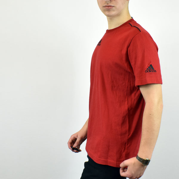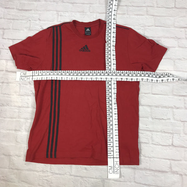 Vintage Adidas T shirt in red. Unisex. Same/Next day UK postage, instant buy is on! Features the famous three stripes on the side of the t shirt. Very good condition. Size L best fitting. Model is 181cm/5ft11.