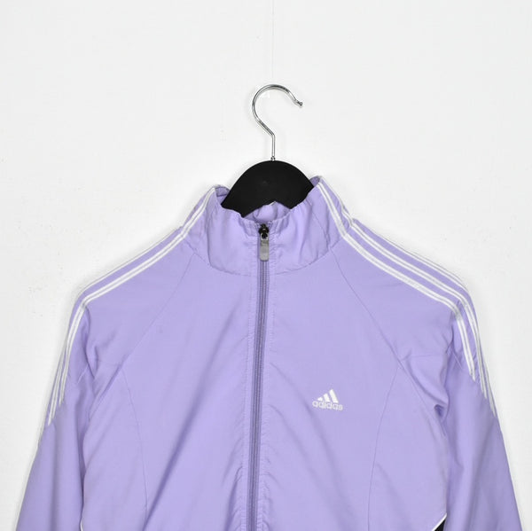 Vintage Adidas track jacket windbreaker zip up hoodie pullover sweatshirt top jumper in purple and black. Unisex. Same/Next day postage, instant buy is on! Good condition. Faults can be seen in the pictures: stains on the front. Has a logo on the front. Label says M, we recommend XS.
