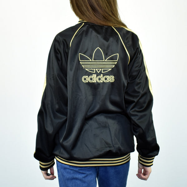 Vintage Adidas tracksuit track jacket fleece windbreaker in black and gold. Unisex. Same/Next day UK postage, instant buy is on! Great condition. Has a logo on the front and a big one on the back. Size S best fitting. Model is 163cm/5ft4. Please message with any questions 👌