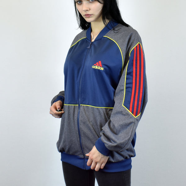 Vintage Adidas tracksuit track jacket fleece windbreaker in navy blue and gray. Unisex. Same/Next day postage, instant buy is on! Very good condition. Has a big Adidas logo on the back. Size L best fitting. Model is 165cm/5ft5. Please message with any questions 👌