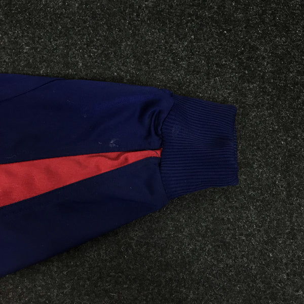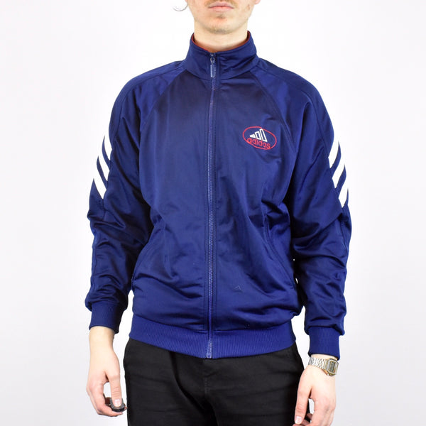 Vintage Adidas tracksuit track jacket fleece windbreaker in navy blue and red. Unisex. Same/Next day UK postage, instant buy is on! Good condition, though has some small probably washable stains on the sleeve. Has a logo on the front and on the back. Size M best fitting. Model is 181cm/5ft11. 100% polyester. Please message with any questions 👌