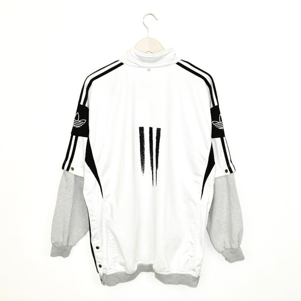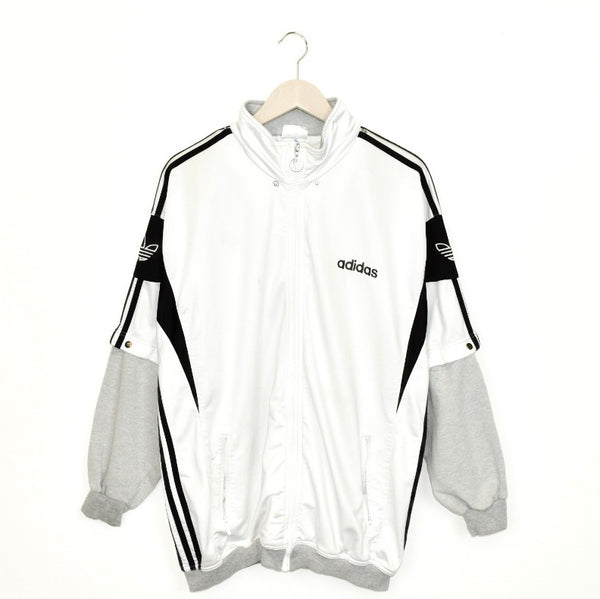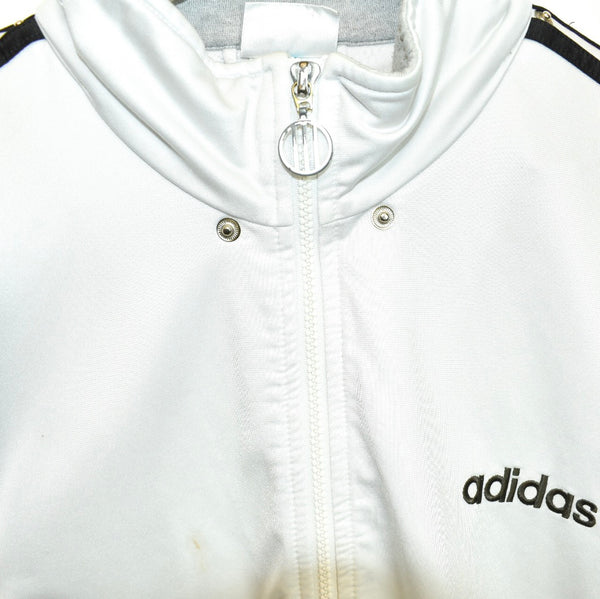 Vintage adidas tracksuit trackie jacket zip up sweater in white black and grey. Unisex. Same/Next day UK postage, instant buy is on! Good condition. Faults are shown in the picture: a small yellow stain on the front and back, and a used up zipper. Features an embroidered adidas logo on the front and on both of the sleeves. Label says L, we recommend L.