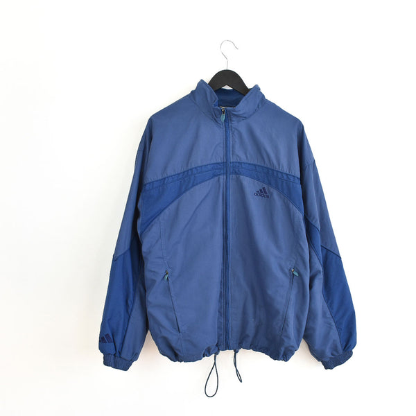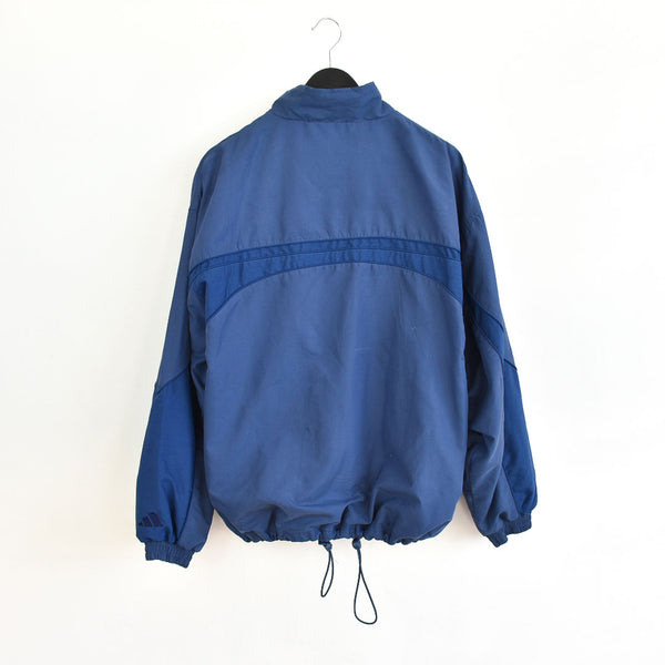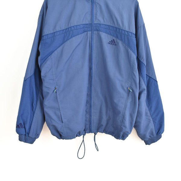 Vintage Adidas windbreaker zip up jacket fleece track jacket bomber jacket jumper in dark blue. Unisex. Same/Next day postage, instant buy is on! Great condition. Has a logo on the front. Label says L, we recommend L. Measurements: * Pit to pit - 24in/61cm * Top to bottom - 27in/68cm * Pit to cuff - 18in/48cm Please message with any questions LL4