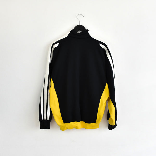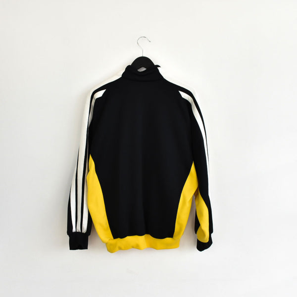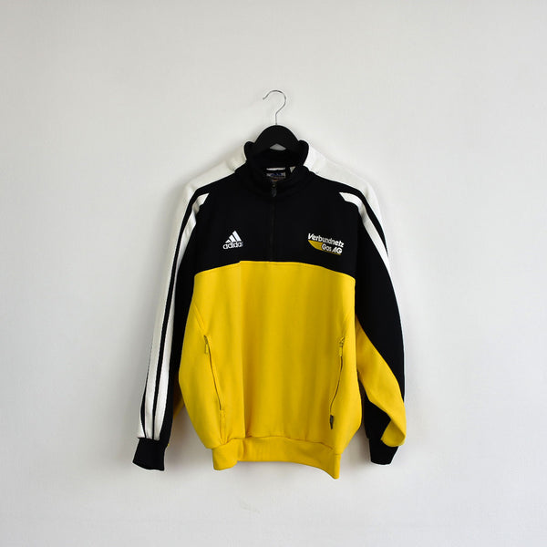 Vintage Adidas zip up crewneck jumper pullover sweatshirt windbreaker fleece track jacket hoodie in black and yellow. Unisex. Same/Next day postage, instant buy is on! Very good condition. Has a logo on the front. Label says M, we recommend M.