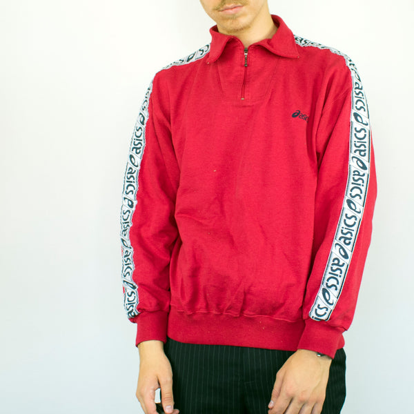 Vintage Asics half zip fleece sweatshirt hoodie jumper sweater pullover in red. Unisex. Same/Next day postage, instant buy is on! Very good condition. Has a small logo on the front and logo printed tape on the sleeves. Size L best fitting. Model is 181cm/5ft11. Please message with any questions 👌