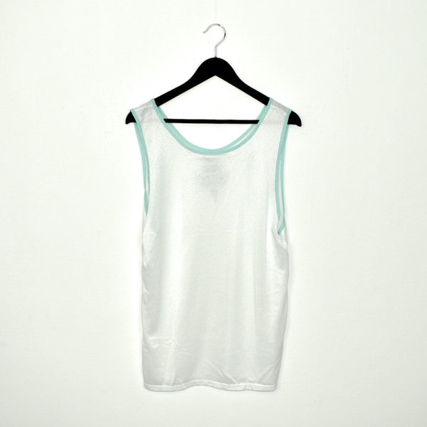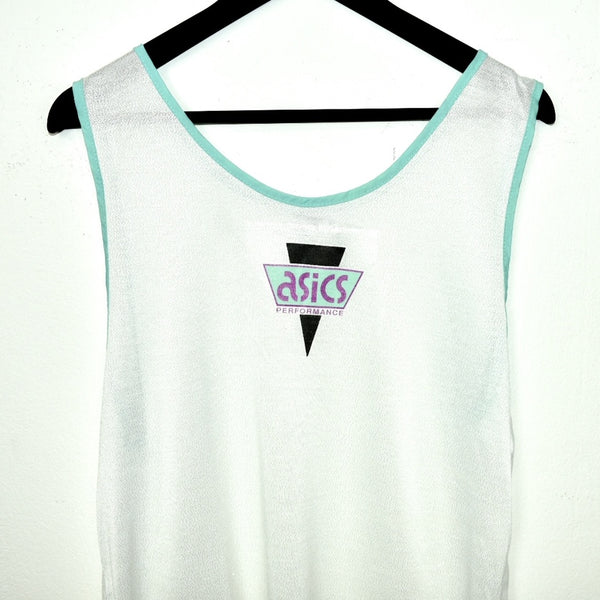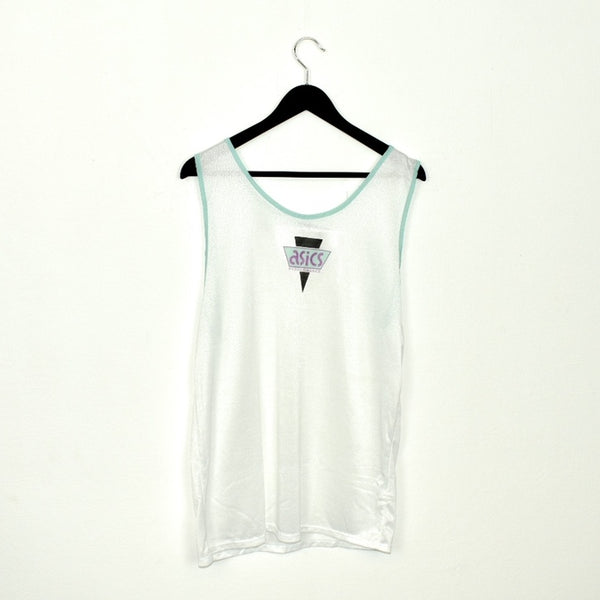 Vintage Asics sleeveless t-shirt top blouse tee in white. Unisex. Same/Next day postage, instant buy is on! Very good condition. Has a logo on the front. We recommend M.
