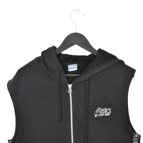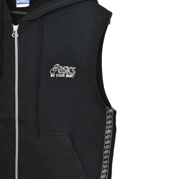 Vintage Asics sleeveless zip up hoodie sweatshirt pullover jumper top in black. Unisex. Same/Next day postage, instant buy is on! Very good condition. Has a spell out logo on the front. Label says S, we recommend M.