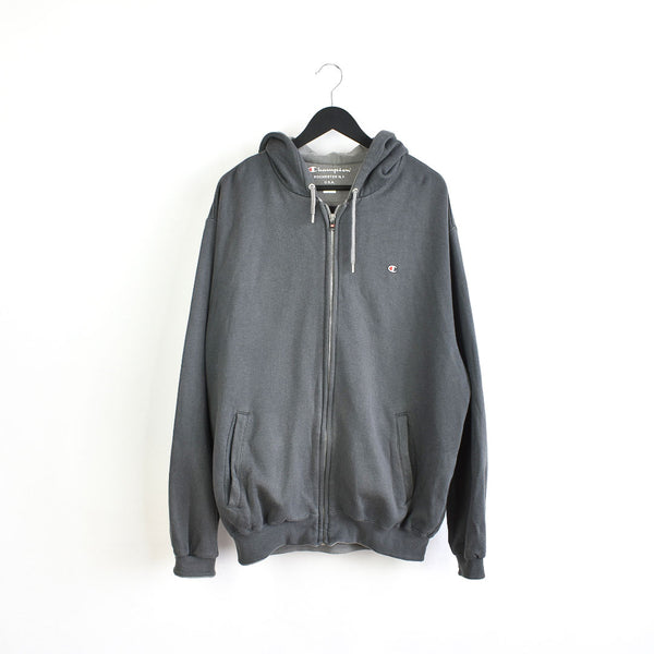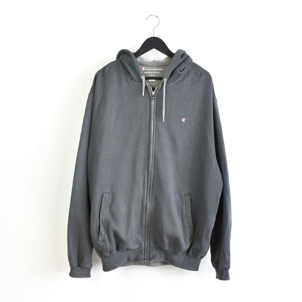 Vintage Champion hoodie track zip up jacket jumper longsleeve tee pullover sweatshirt in dark grey. Unisex. Same/Next day postage, instant buy is on! Good condition. Fault can be seen in the picture: stain on the sleeve. Has a logo on the front. Label says XL, we recommend XL. Measurements: * Pit to pit - 21in/53cm * Top to bottom - 24in/60cm * Pit to cuff - 20in/52cm Please message with any questions EE13