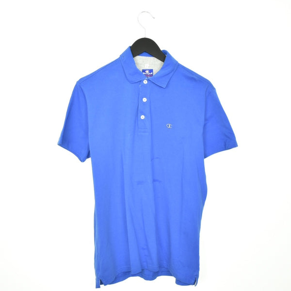 Vintage Champion polo shirt t-shirt in blue. Unisex. Same/Next day UK postage, instant buy is on! Features an embroidered logo on the front. Good condition. Faults are shown in the pictures: some stains on the front and back. Label says S, we recommend M.