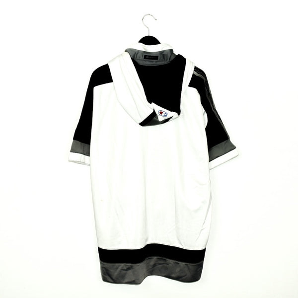 Vintage Champion sleeveless tracksuit track jacket fleece windbreaker in gray, white, black. Unisex. Same/Next day UK postage, instant buy is on! Good condition. Faults are shown in the picture: a small stain on the back. Has a hood with drawstrings, small logo on the front and logos on the shoulders. Size L best fitting. Measurements: