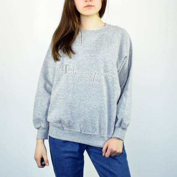 Vintage Champion sweatshirt jumper sweater pullover hoodie in gray. Unisex. Same/Next day postage, instant buy is on! Very good condition. Has a big logo on the front. Size S best fitting. Model is 163cm/5ft4. Please message with any questions 👌