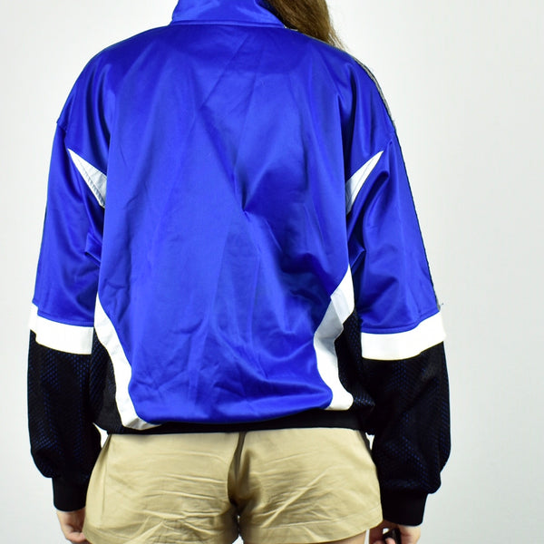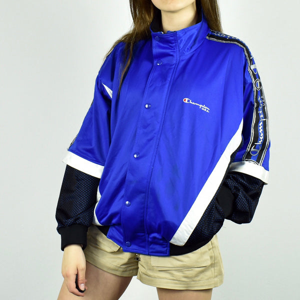 Vintage Champion tracksuit track jacket fleece windbreaker in navy blue, white and black. Unisex. Same/Next day UK postage, instant buy is on! Very good condition. Has logos on the front and the sleeves, mesh material on sleeves and sides. Size S best fitting. Model is 163cm/5ft4. Please message with any questions 👌