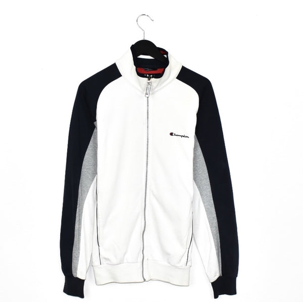 Vintage Champion zip up pullover sweatshirt windbreaker fleece track jacket in white black and grey. Unisex. Same/Next day postage, instant buy is on! Great condition. Has a spell out logo on the front. Label says L, we recommend L.