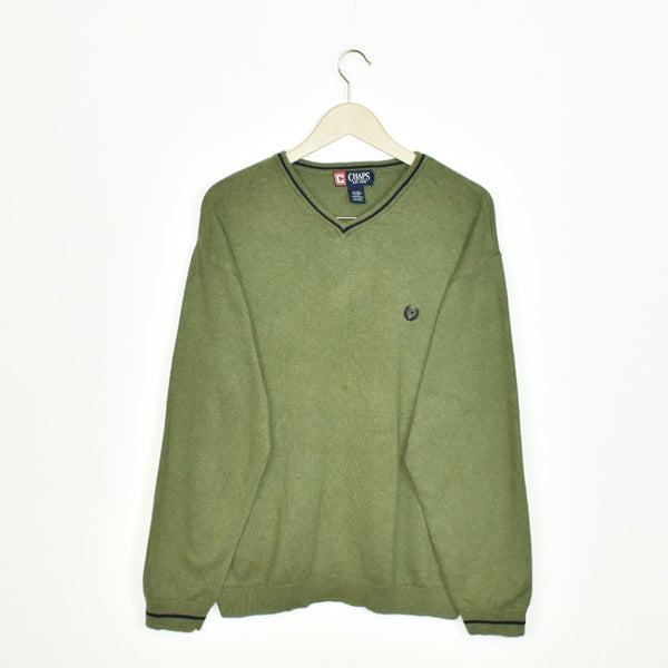 Vintage Chaps v neck sweater thin material longsleeve tee pullover sweatshirt in dark green.. Unisex. Same/Next day postage, instant buy is on! Good condition. Faults are shown in the picture: a small stain on the front. Has a logo on the front. Label says L, we recommend L.