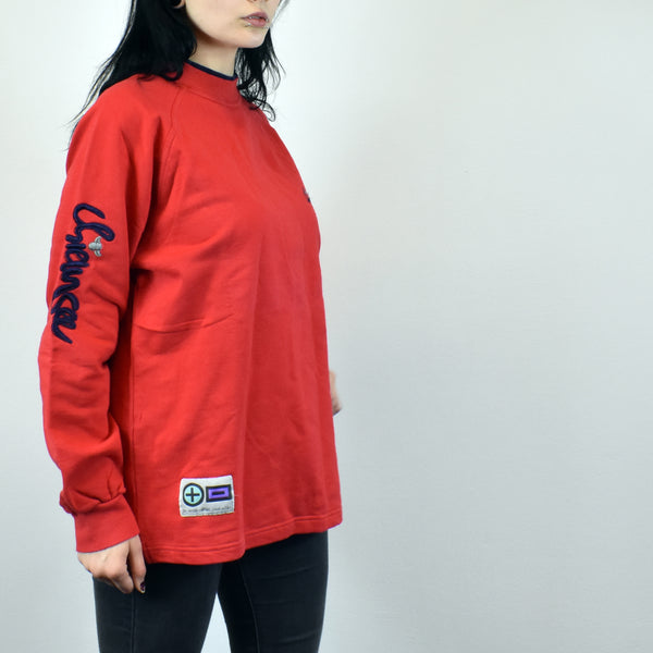 Vintage Chiemsee sweatshirt jumper sweater pullover hoodie in red. Unisex. Same/Next day postage, instant buy is on! Good condition, though has some stains on the back. Features a cool design on the back. Size M best fitting. Model is 165cm/5ft5. Please message with any questions 👌