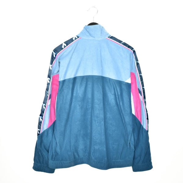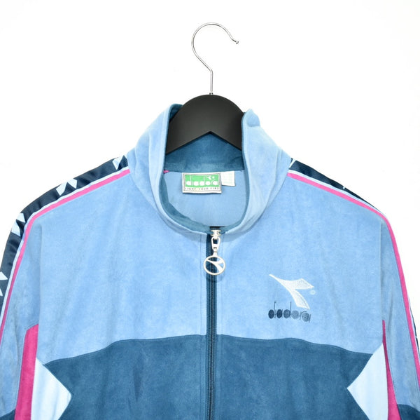 Vintage Diadora velvet tracksuit track jacket trackie sweater jumper sweatshirt pullover long sleeve in purple baby blue pink and white. Unisex. Same/Next day UK postage, instant buy is on! Pretty good condition. Faults are shown in the pictures: stains on the front and a hole in one of the sleeves. Features Diadora logo on the front. Label says L, we recommend L.