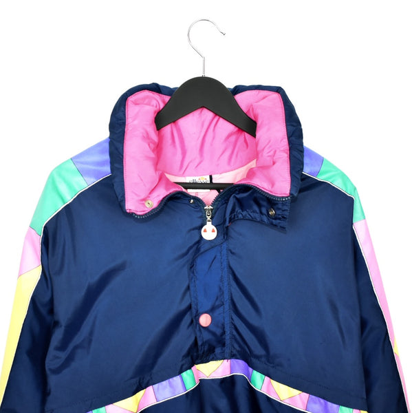 Vintage Ellesse pullover button up jacket windbreaker tracksuit track jacket trackie sweater jumper sweatshirt long sleeve in dark blue and rainbow. Unisex. Same/Next day UK postage, instant buy is on! Pretty great condition. Faults are shown: worn off color on one of the sleeves. Features Ellesse logo on the zipper. We recommend XL/XXL.