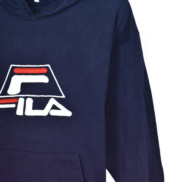 Vintage Fila hoodie pullover sweatshirt windbreaker fleece track jacket in dark blue. Unisex. Same/Next day postage, instant buy is on! Very good condition. Has a big spell out logo on the front. We recommend M.