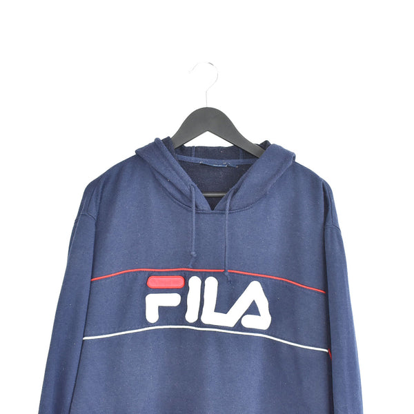 Vintage Fila hoodie pullover sweatshirt windbreaker fleece track jacket jumper in dark blue, red and white. Unisex. Same/Next day postage, instant buy is on! Very good condition. Has a spell out logo on the front. Label says L, we recommend M. Measurements: * Pit to pit - 21in/55cm * Top to bottom - 21in/53cm * Pit to cuff - 17in/44cm Please message with any questions OO14