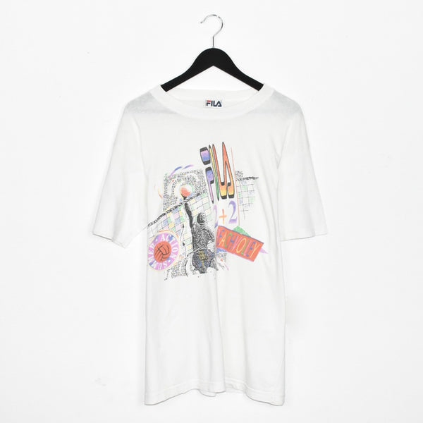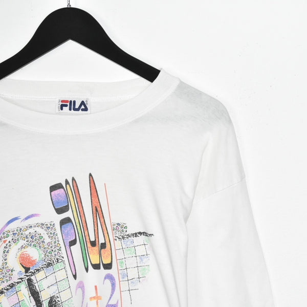 Vintage Fila t-shirt top blouse tee in white. Unisex. Same/Next day postage, instant buy is on! Very good condition. Has a cool design on the front. We recommend L.