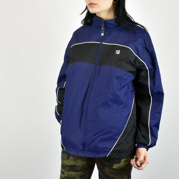 Vintage Fila windbreaker fleece jacket in navy blue and black. Unisex. Same/Next day UK postage, instant buy is on! Very good condition. Size L best fitting. Model is 165cm/5ft5. 100% nylon