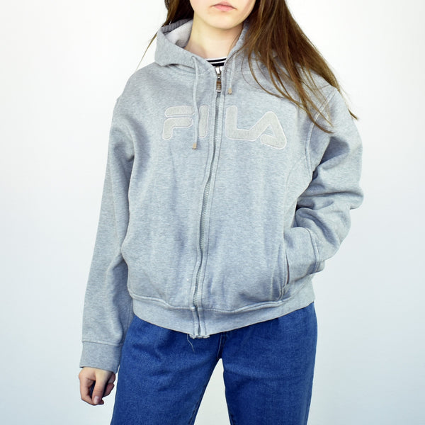 Vintage Fila zip up hoodie jumper sweater pullover in gray. Unisex. Same/Next day postage, instant buy is on! Very good condition. Has a big spellout on the front and drawstrings on the hood. Size S best fitting. Model is 163cm/5ft4. Please message with any questions 👌