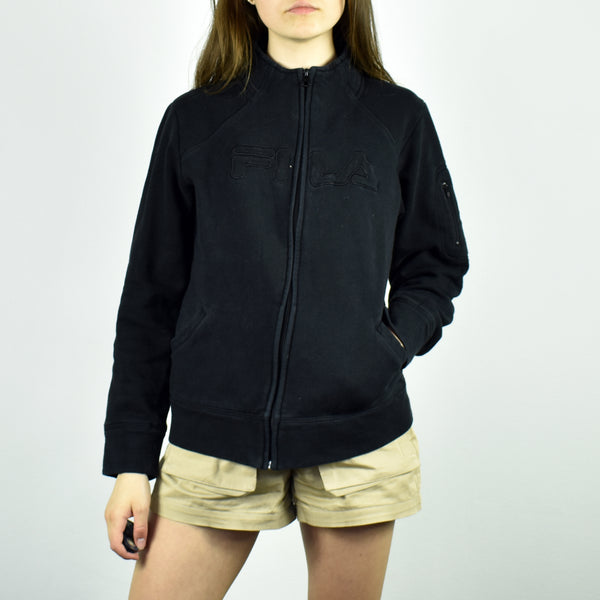 Vintage Fila zip up sweatshirt hoodie jumper sweater pullover in black. Unisex. Same/Next day postage, instant buy is on! Very good condition. Has a big spellout on the front and a pocket on the sleeve. Size S best fitting. Model is 163cm/5ft4. Please message with any questions 👌