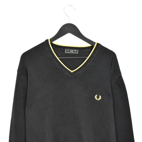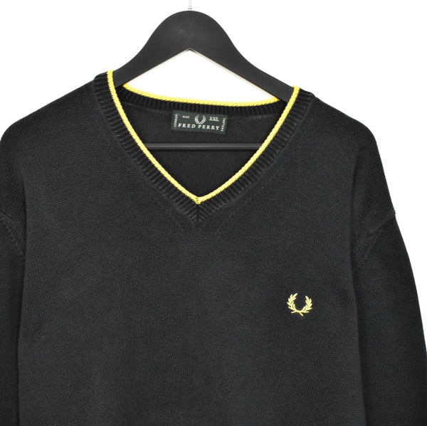 Vintage Fred Perry V neck neck sweater thin material longsleeve tee pullover sweatshirt in black and gold. Unisex. Same/Next day postage, instant buy is on! Great condition. Has a logo on the front. Label says XXL, we recommend XXL.
