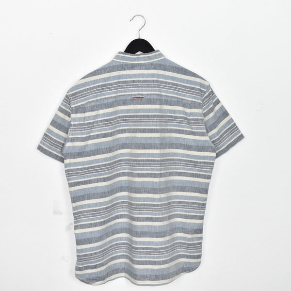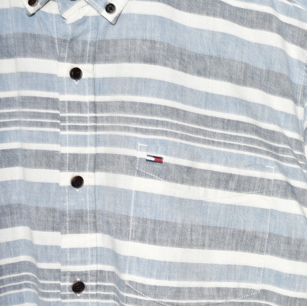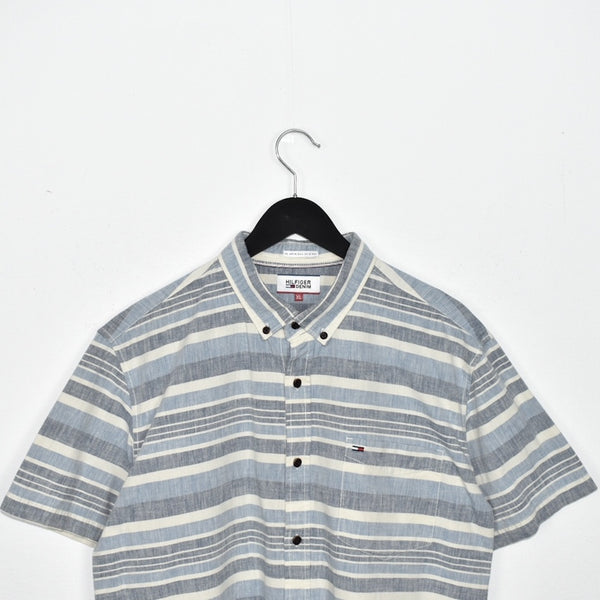 Vintage Hilfiger Denim formal button up shirt short sleeve top in dark blue. Unisex. Same/Next day UK postage, instant buy is on! Great condition. Features Tommy Hilfiger logo on the front. Label says XL, we recommend XL.