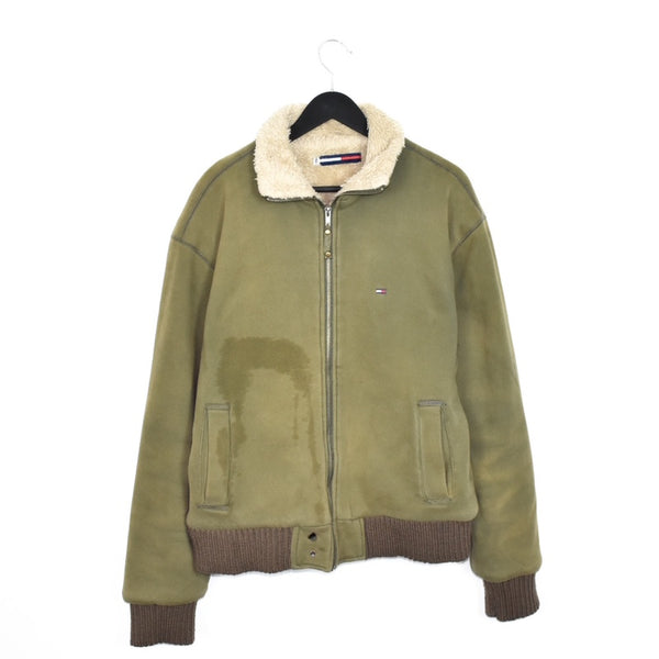 Vintage Hilfiger fur bomber jacket windbreaker coat in army green. Unisex. Same/Next day postage, instant buy is on! Good condition. Stain on the front, worn off. Big spell out logo on the back, small one on the front. Label says XL, we recommend XL.