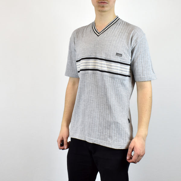 Vintage Hugo Boss v-neck t-shirt top blouse tee in gray. Unisex. Same/Next day postage, instant buy is on! Very good condition. Has a small logo on the front. Size M best fitting. Model is 181cm/5ft11. Please message with any questions 👌