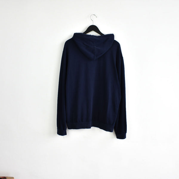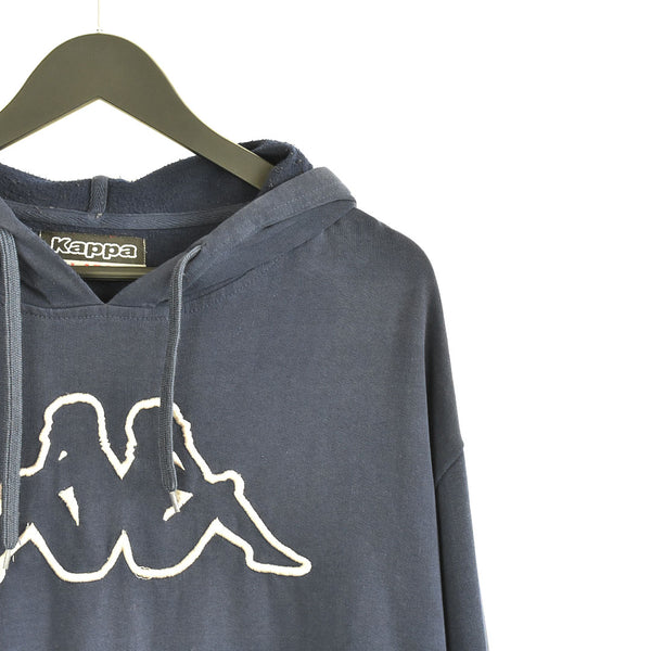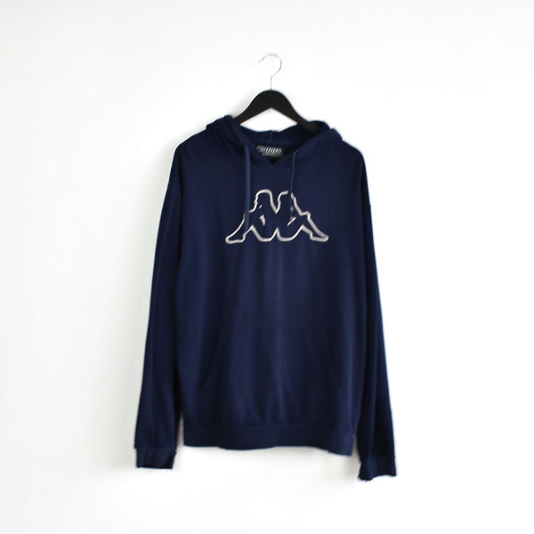 Vintage Kappa hoodie pullover sweatshirt windbreaker fleece track jacket jumper in dark blue and white. Unisex. Same/Next day postage, instant buy is on! Pretty good condition. Faults are shown in the picture: sleeves have some holes. Has an embroidered logo on the front. Label says XL, we recommend L. Measurements: * Pit to pit - 22in/56cm * Top to bottom - 26in/66cm * Pit to cuff - 18in/48cm Please message with any questions AE17