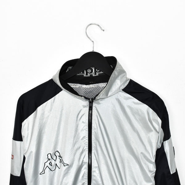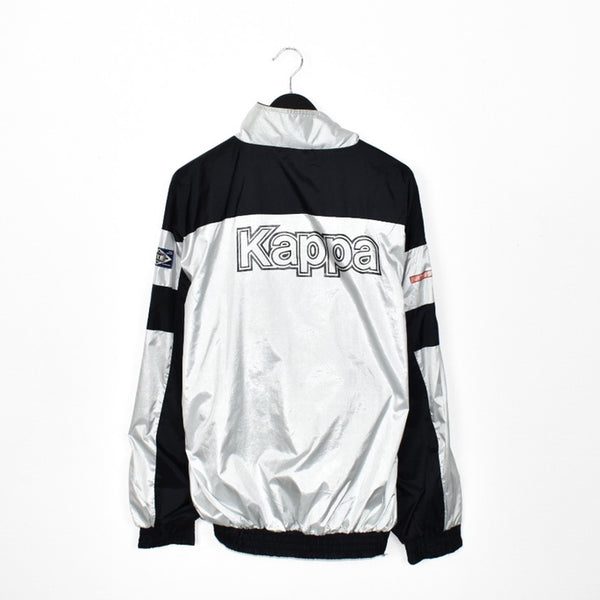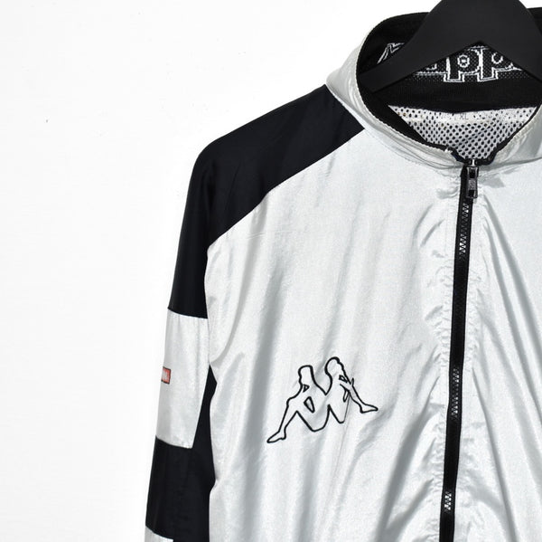 Vintage Kappa zip up tracksuit track jacket trackie sweater windbreaker jumper sweatshirt pullover long sleeve in black and silver. Unisex. Same/Next day UK postage, instant buy is on! Great condition. Features Kappa spell out logo on the front and back. Label says XL, we recommend L.