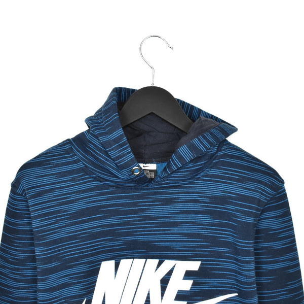 Vintage Nike hoodie pullover sweatshirt windbreaker fleece track jacket in black and blue. Unisex. Same/Next day postage, instant buy is on! Very good condition. Has a big spell out logo on the front. Label says M, we recommend M.