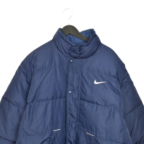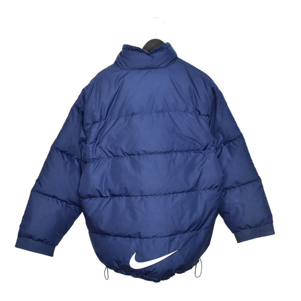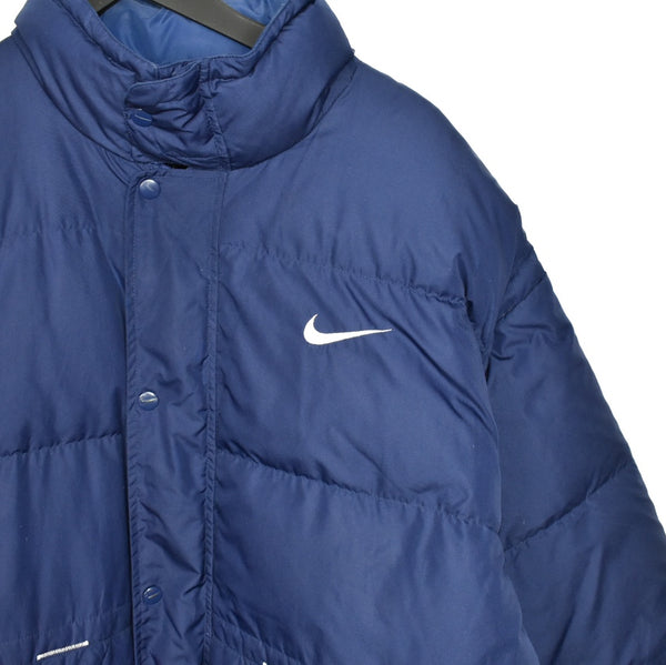 Vintage Nike puffer jacket bomber zip up track jacket windbreaker sweatshirt longsleeve tee pullover jumper in blue and white. Unisex. Same/Next day postage, instant buy is on! Great condition. Has a logo on the front and back. We recommend XL.