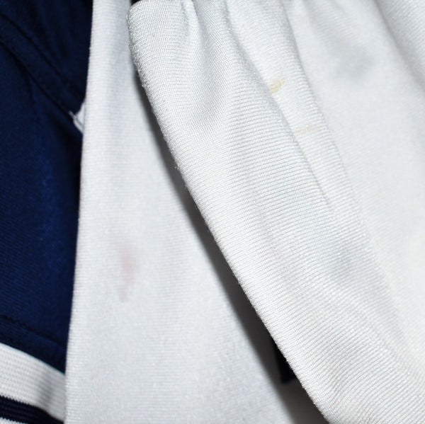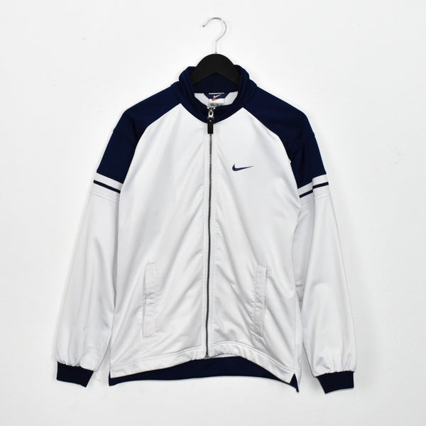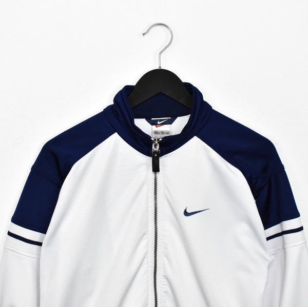 Vintage Nike zip up windbreaker tracksuit track jacket trackie sweater jumper sweatshirt pullover long sleeve in white and blue. Unisex. Same/Next day UK posting, instant buy is on! Good condition. Has a lot of little stains. Features Nike logo on the front and a big spell out logo on the back. Label says XL, we recommend M.