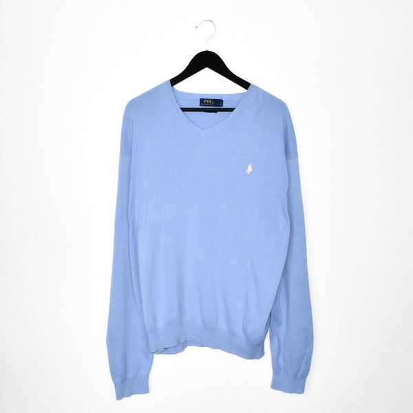 Vintage Polo Ralph Lauren V-neck thin material longsleeve tee pullover sweater in baby blue. Unisex. Same/Next day postage, instant buy is on! Good condition. Faults are shown in the picture: some stains on one of the sleeves. Has a logo on the front. Label says XXL, we recommend L/XL.