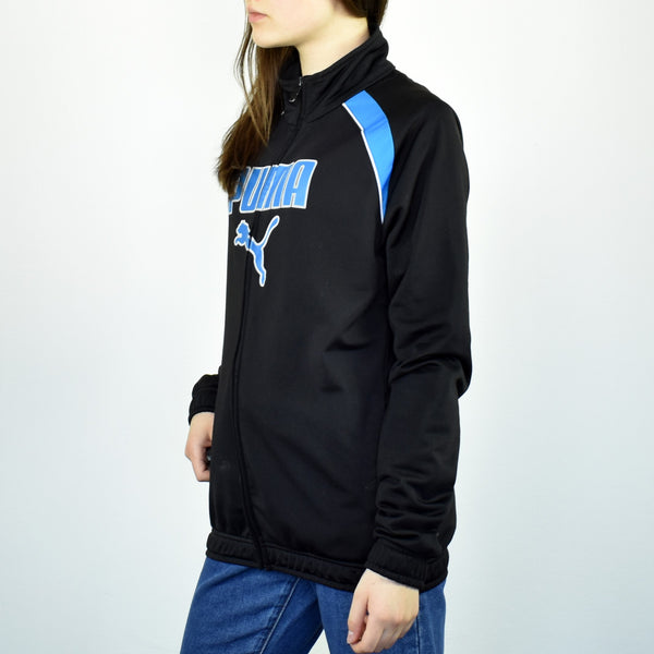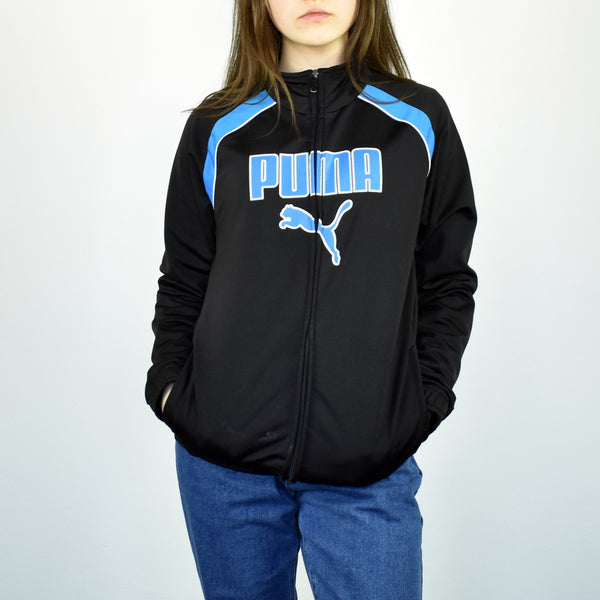 Vintage Puma tracksuit track jacket fleece windbreaker in black and blue. Unisex. Same/Next day UK postage, instant buy is on! Great condition. Has a big logo on the front. Size S best fitting. Model is 163cm/5ft4. Please message with any questions 👌
