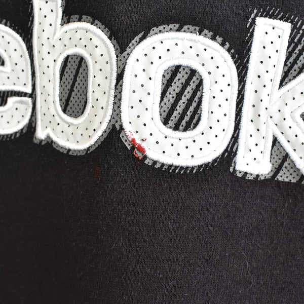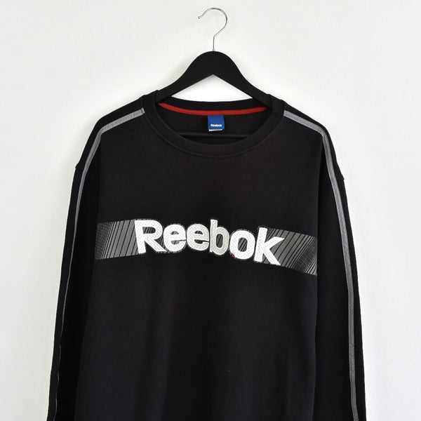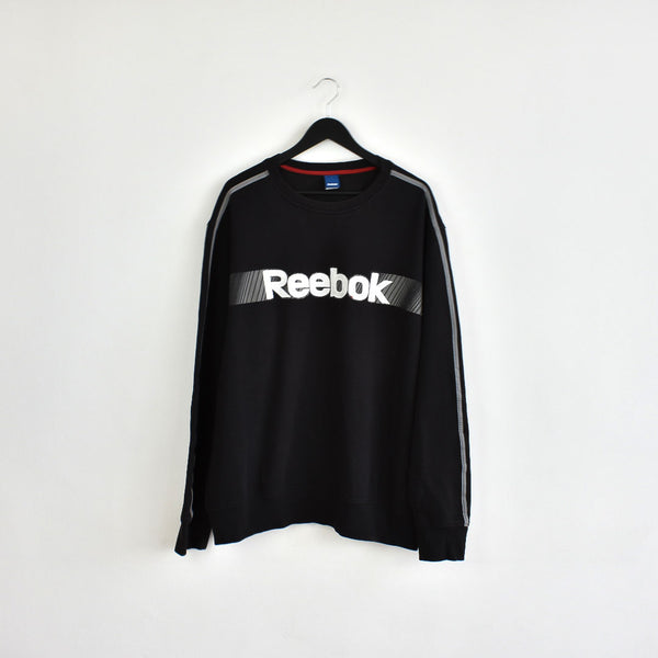 Vintage Reebok crewneck jumper pullover sweatshirt windbreaker fleece track jacket hoodie in black and white. Unisex. Same/Next day postage, instant buy is on! Pretty good condition. Faults are shown in the picture: red stain on the logo. Has a spell out logo on the front. Label says 2XL, we recommend 2XL.